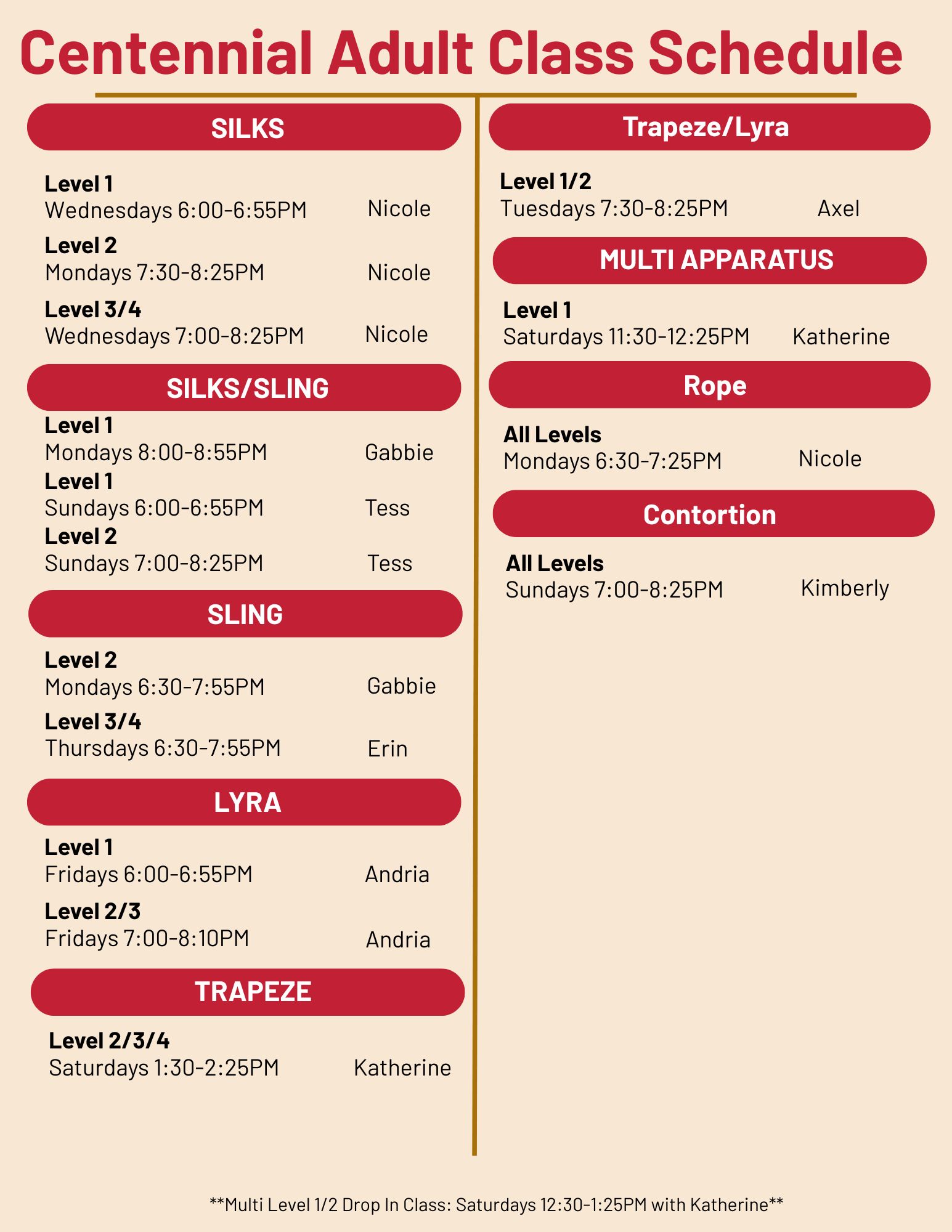 We offer a variety of intermediate and advanced adult aerial classes (levels 2, 3, and 4). These include solo apparatuses classes in: