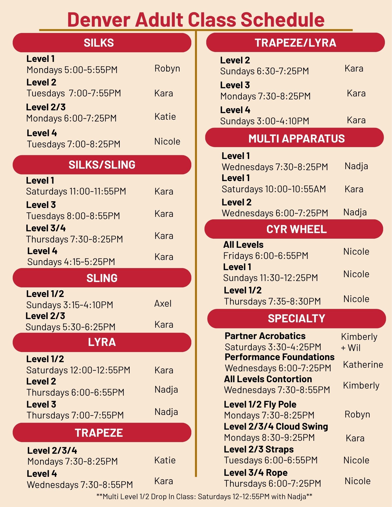 We offer mixed apparatus (2 specialties) and multi-apparatus course (4 apparatuses). We are also the only aerial arts gym in Denver with cyr wheel classes! Additionally, we have non-trick based and fitness classes including flexibility & contortion, aerial yoga (anti-gravity yoga), and aerial Pilates depending on coach availability. Finally, if you are interested in performing, we have an Adult only Performance Company for our Intermediate/Advanced (level 2+) students. See level prerequisites here.