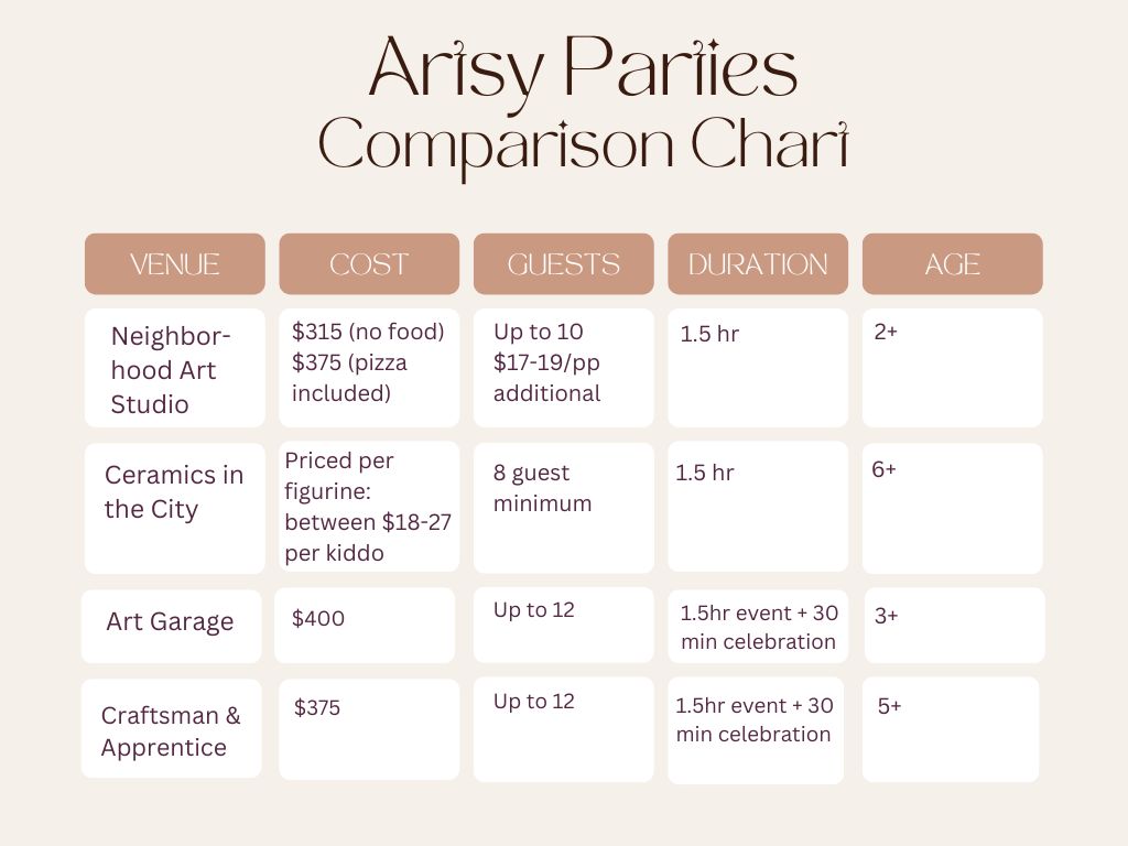 There is an 8-guest minimum, and prices are charged per person, between $18 and $27 depending on the figurine. They note parties are best for ages 6+.